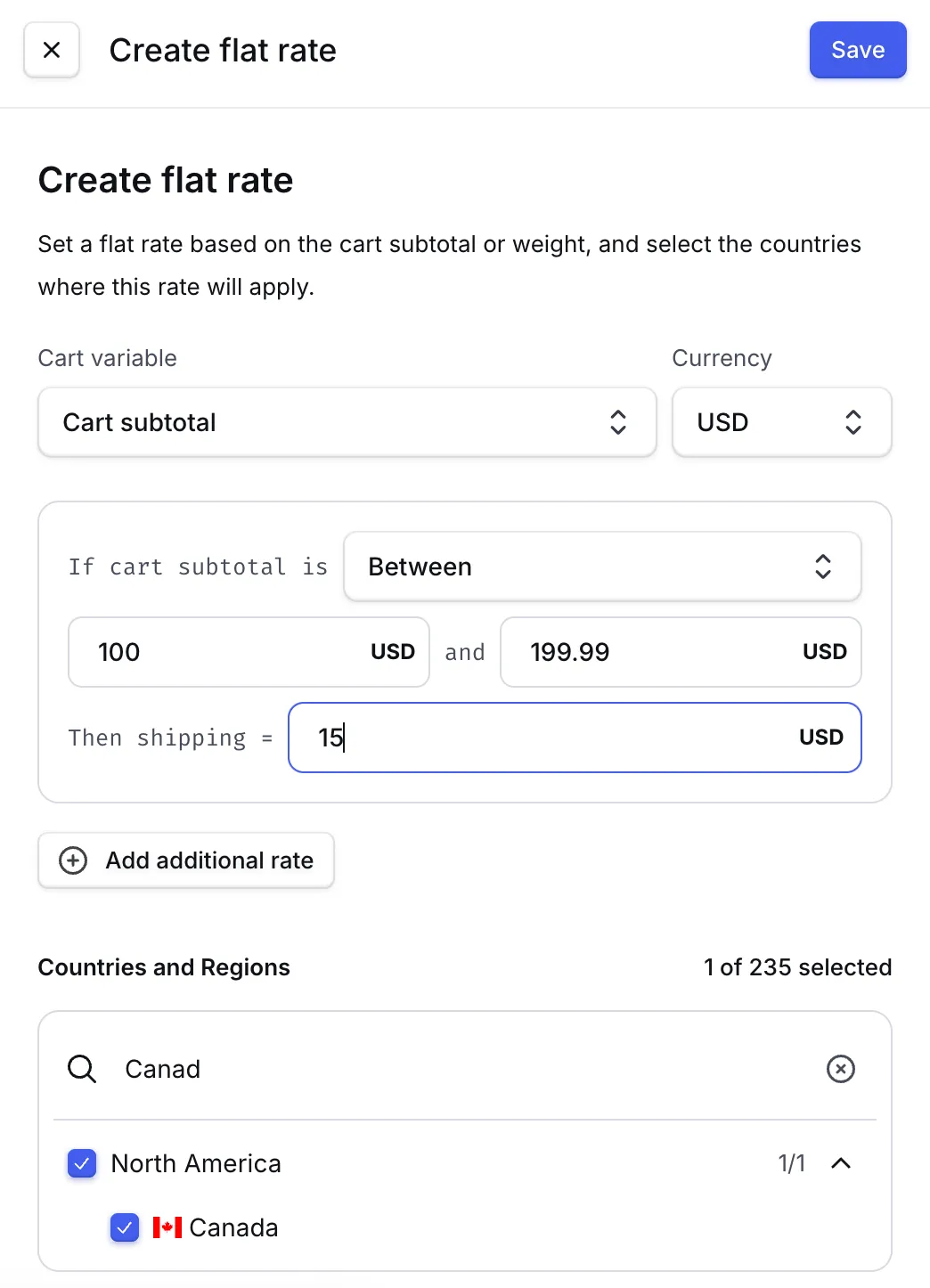 Entre s'applique aux valeurs dans une plage définie, excluant le premier nombre mais incluant le dernier. Entrer "entre 100 USD et 199,99 USD" appliquera votre rate sur les paniers de 100,01 USD à 199,99 USD.