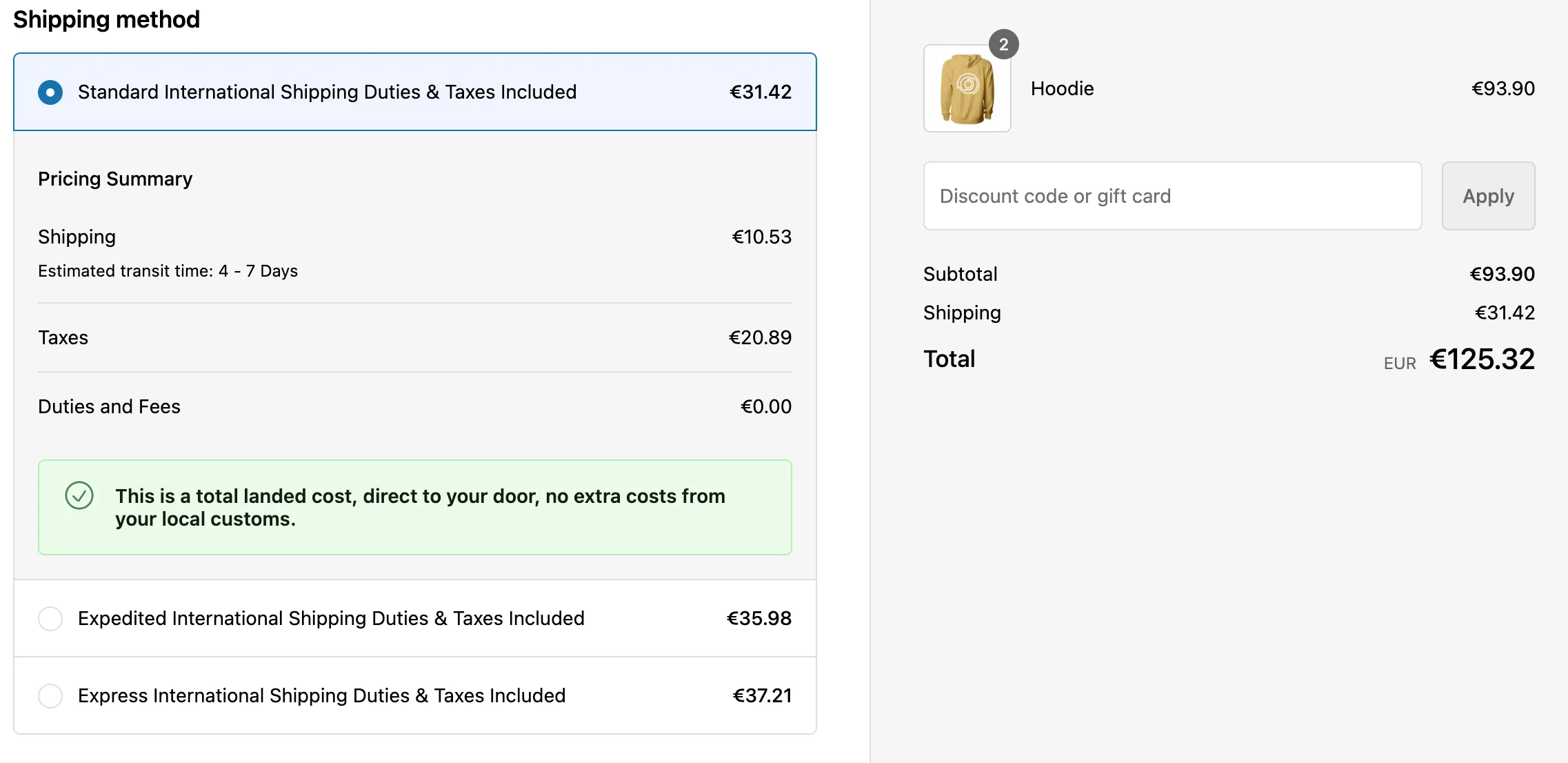 Lorsqu'il est activé, le détail amélioré des droits et taxes développera l'option d'expédition sélectionnée pour afficher les droits et taxes séparément du coût d'expédition. Les acheteurs pourront voir une répartition du coût d'expédition, des droits, des taxes et du temps de transit avant de finaliser leur achat.
