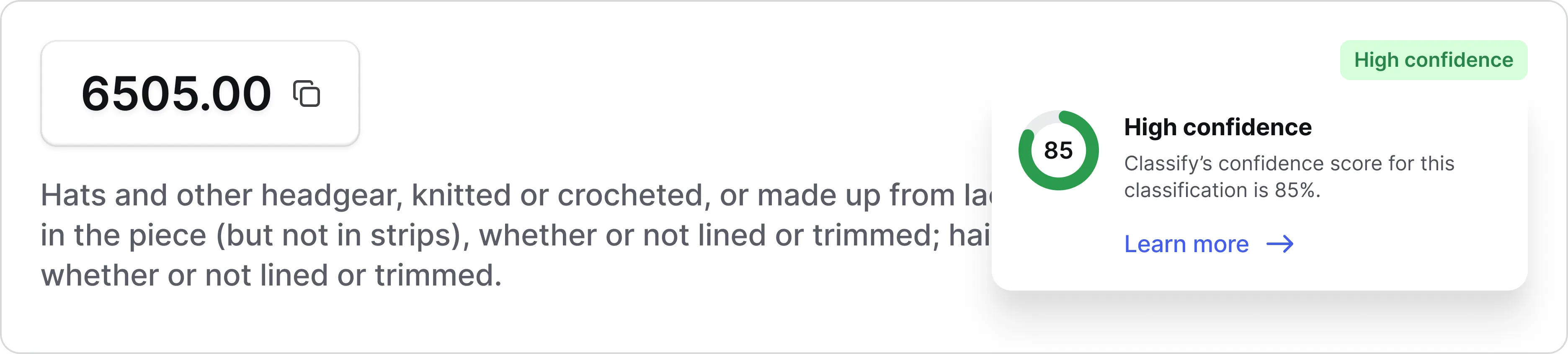 Bien que Classify ait un score de confiance par défaut, vous pouvez ajuster le score pour répondre à vos besoins commerciaux. Si le score de confiance est inférieur à votre pourcentage souhaité, Classify ne renverra pas de code SH. Au lieu de cela, il vous informera qu'un code SH n'a pas pu être trouvé et vous invitera à ajouter plus d'informations sur le produit.